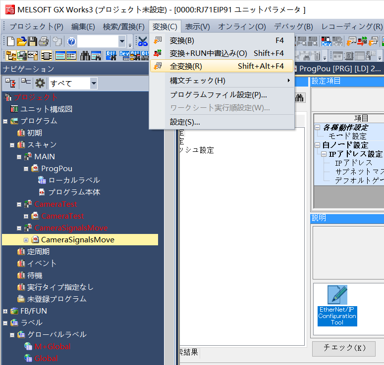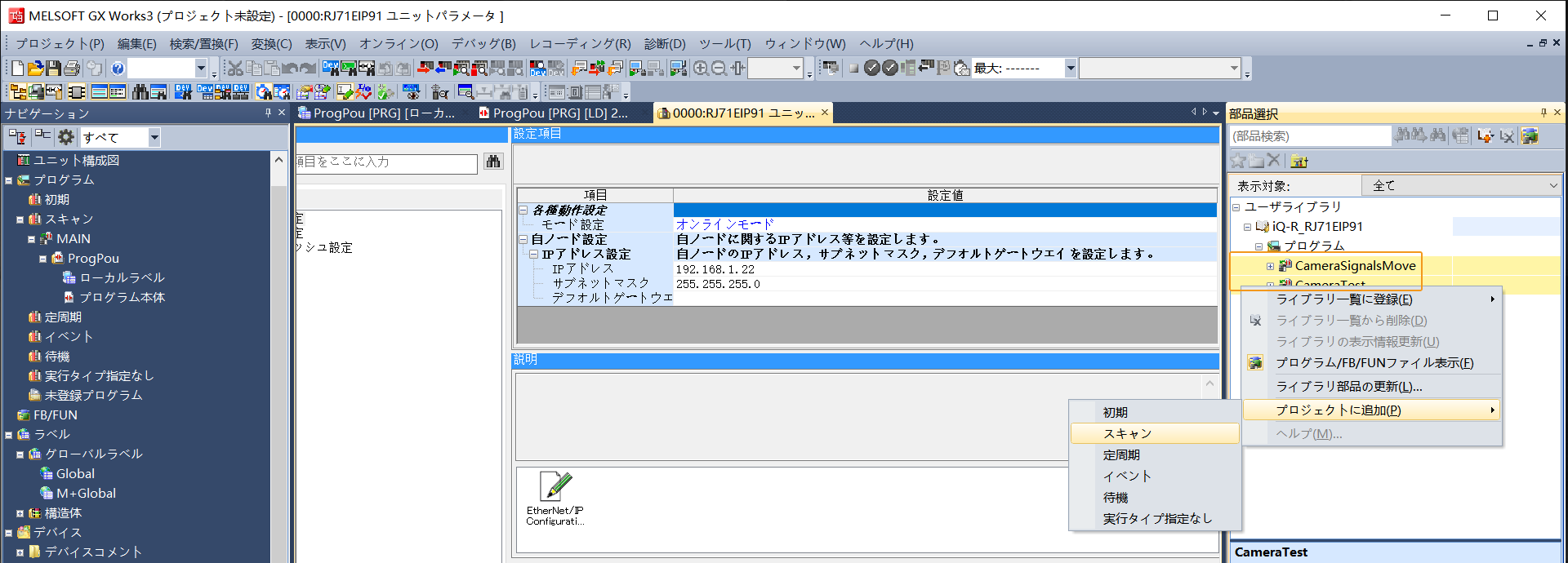 GX Works3 ソフトウェア画面で、右側の 部品選択 で2つのサンプルファイル(CameraSignalsMoveとCameraTest)を選択し、右クリックして を選択します。