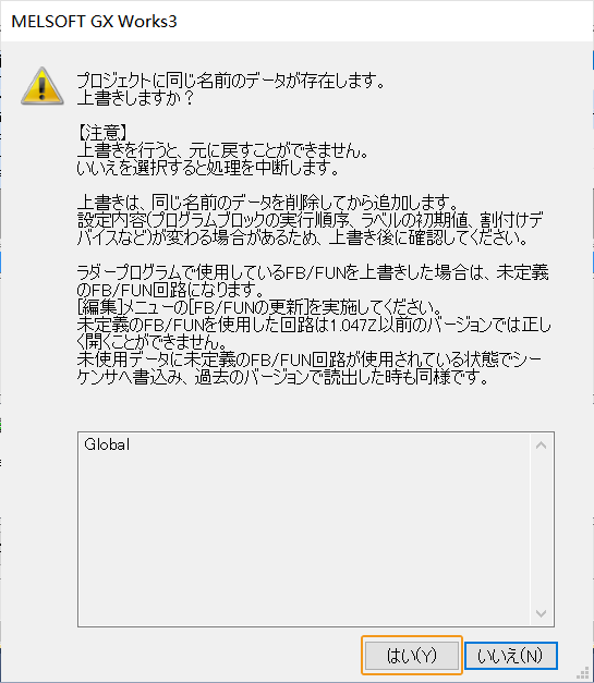 GX Works3ソフトウェア画面に戻り、左側のプロジェクトツリーでサンプルプログラム、機能ブロック、ラベルがすべてインポートされたことを確認し、メニューバーで をクリックします。