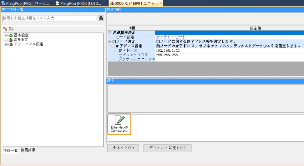 左側のナビゲーションウィンドウで、パラメータ を展開し、追加された 0000:RJ71EIP91 をダブルクリックします。すると、設定項目一覧 ウィンドウがポップアップします。