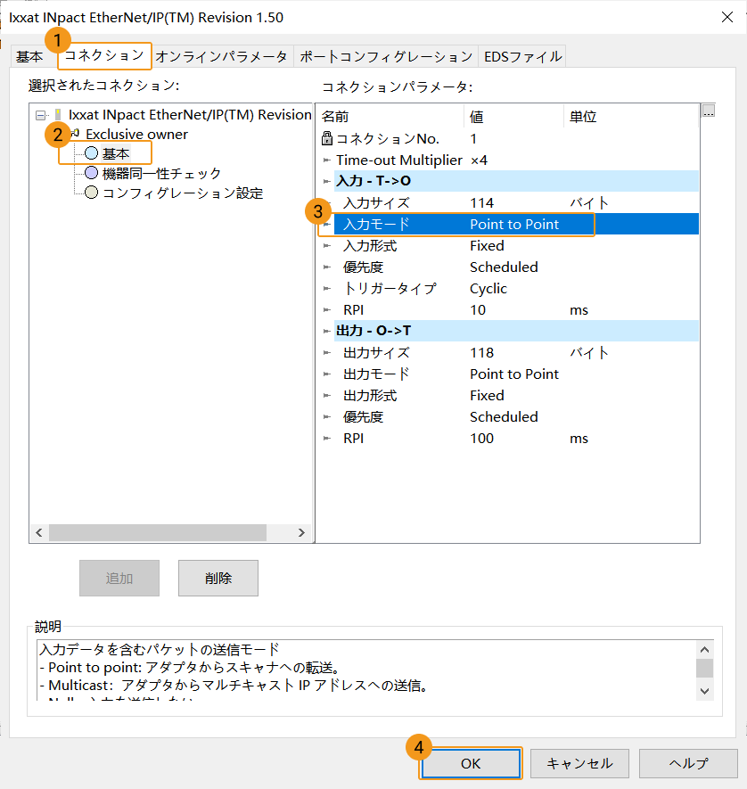 コネクション タブで 基本 をクリックし、「入力モード」の値を「Point to Point」に変更し、「入力サイズ」と「出力サイズ」の通信データ長を記録してから、OK をクリックします。