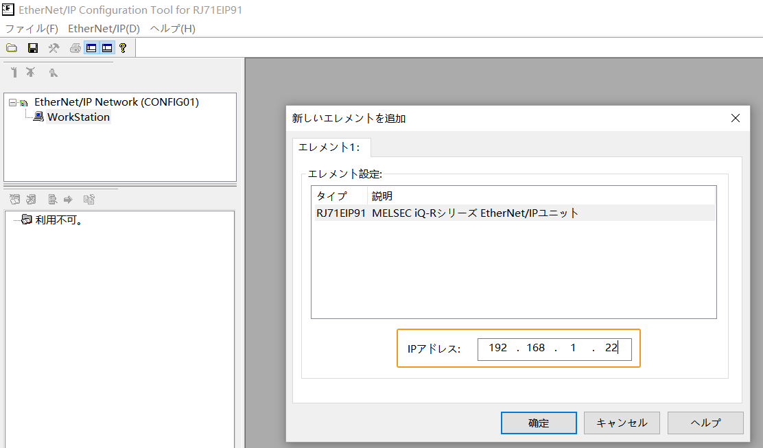 表示された 新しいエレメントを追加 ウィンドウで、RJ71EIP91ユニットのIPアドレスを入力して、OK をクリックします。入力したIPアドレスは、GX Works3ソフトウェアで「0000:RJ71EIP91ユニットパラメータ」に設定されたIPアドレスと一致させる必要があります。