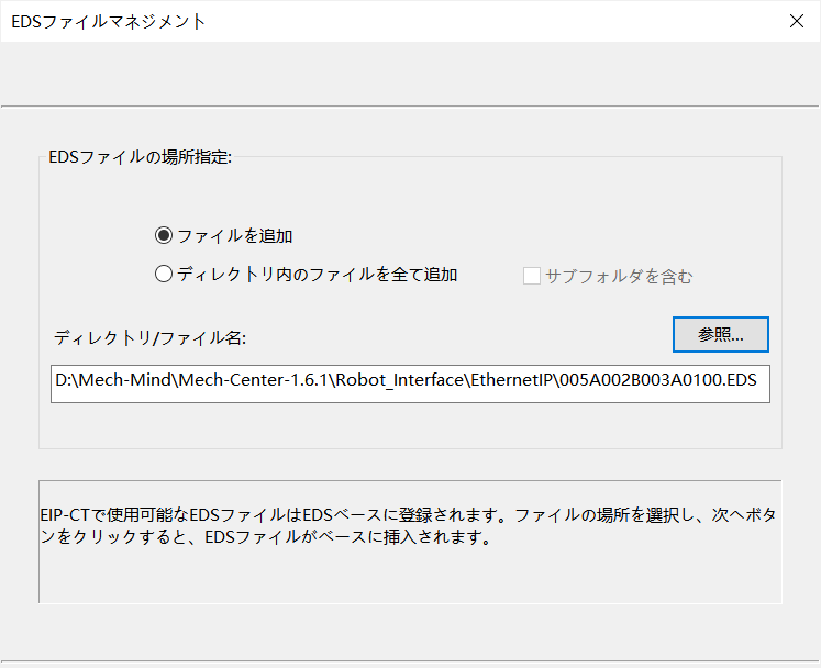 Software EIP.edsファイルは、Mech-VisionおよびMech-Vizソフトウェアのインストールディレクトリにある Communication Component/Robot_Interface/EthernetIP/EDSフォルダに格納されます。