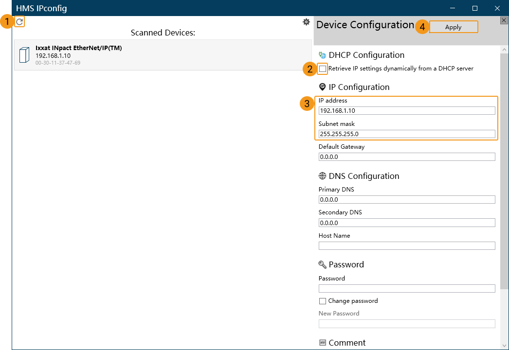 HMS Ipconfigソフトウェアを起動し、スキャンボタンをクリックし、「Retrieve IP Settings Dynamically from a DHCP server」のチェックを外します。ネットワークカードのIPアドレスとサブネットマスクを設定して Apply をクリックし、確認した上でソフトウェアを終了します。