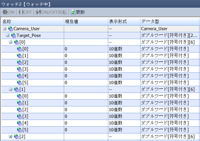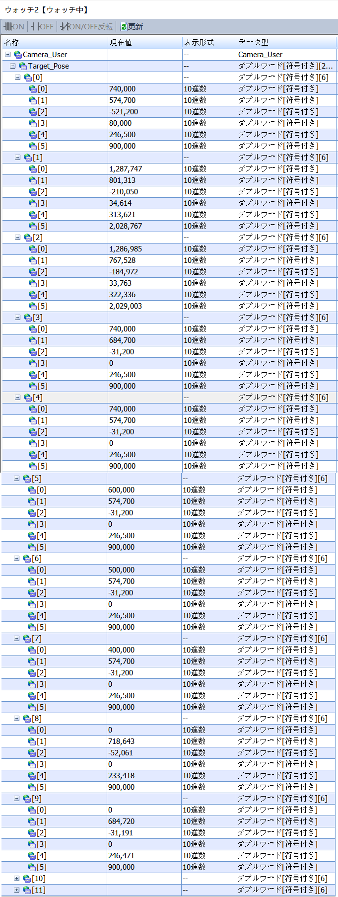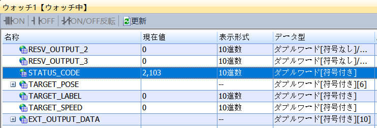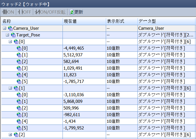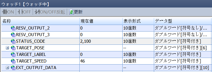 「ウォッチ2」のウィンドウで、Target_Poseの返された値(値は実際の値に10000をかけたもの)を確認します。