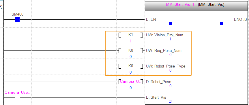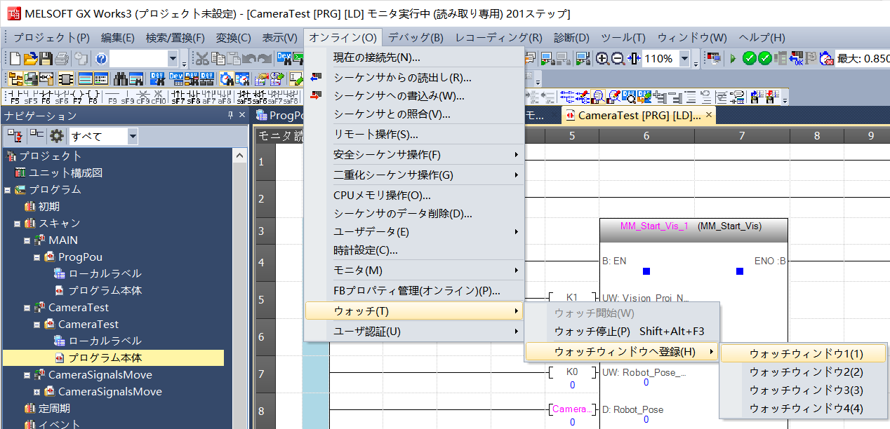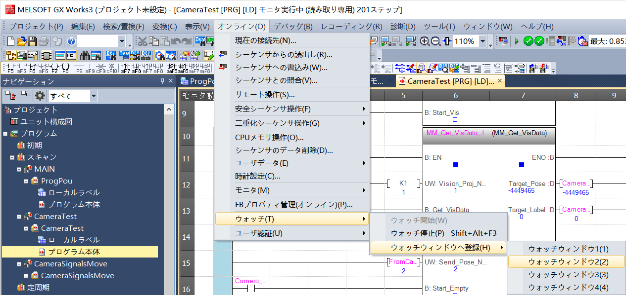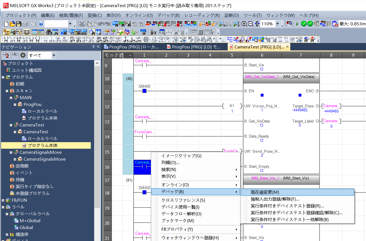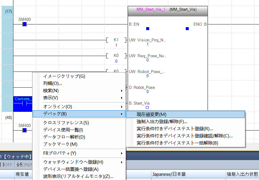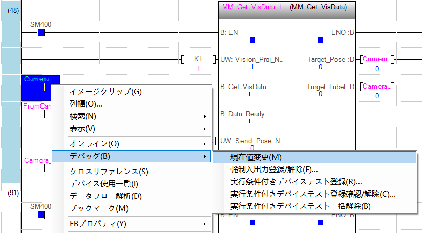 GX Works3ソフトウェア画面で、「MM_Get_VisData」に入力された「Camera_User.Get_VisData」ラベルを右クリックし、 を順番にクリックします。それを1に変更し、位置姿勢の結果が取得されたら、このラベルをリセットします。