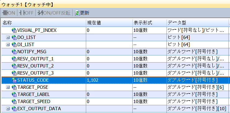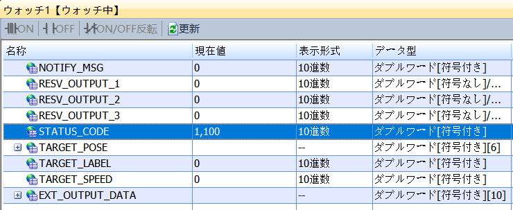 「ウォッチ1」のウィンドウで、STATUS_CODEの返された値を確認します。