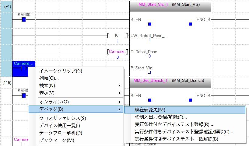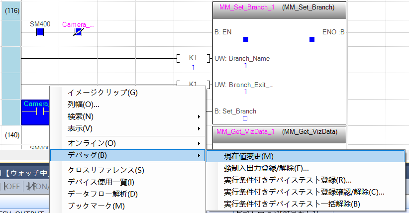 GX Works3ソフトウェア画面で、「MM_Set_Branch」に入力された「Camera_User.Set_Branch」ラベルを右クリックし、 を順番にクリックします。それを1に変更し、Mech-Vizの分岐出口が選択されたら、このラベルをリセットします。
