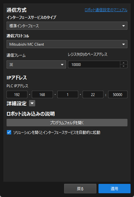 通信方式 の画面で、インターフェースサービスのタイプ を 標準インターフェース に、通信プロトコル を Mitsubishi MC Client に、通信フレームを を 3E に選択し、レジスタ(D)のベースアドレス を実際の状況に合わせて設定します。MM_Interface構造体は合計1528個のDレジスタを占有し、この例では10000を設定しています。