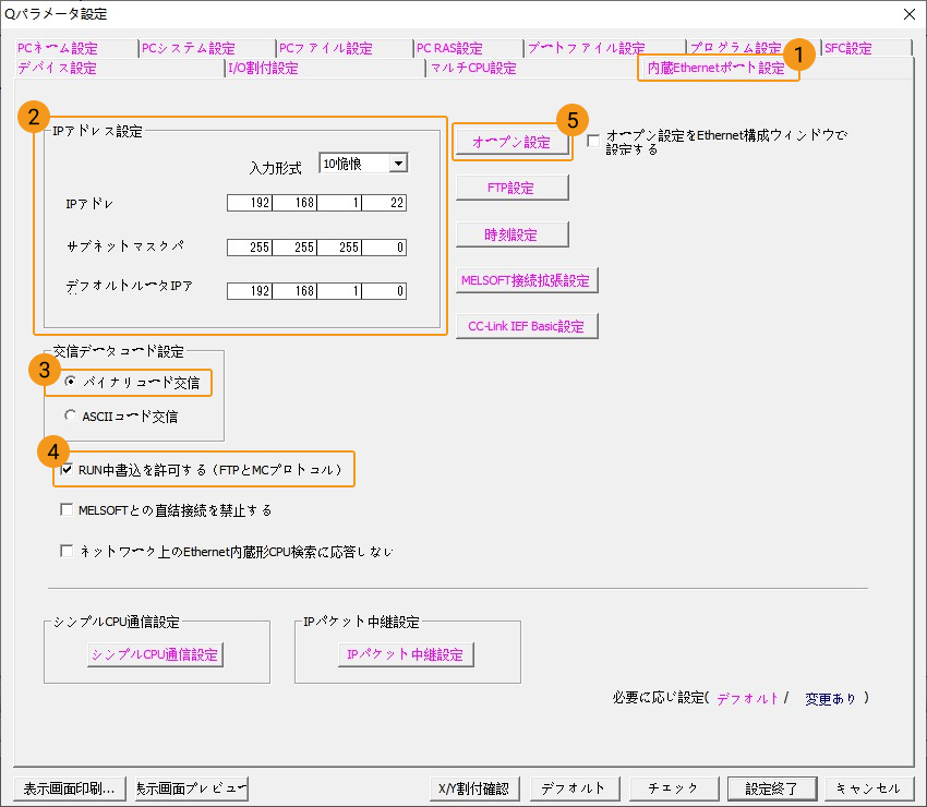 Qパラメータ設定 画面がポップアップします。内蔵Ethernetポート設定 タブをクリックして以下の設定を行います。