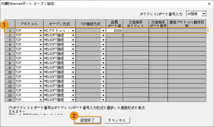 PLC IP アドレス を特定のPLCのIPアドレスを設定し、その後のポートを特定PLCのポートに設定します。