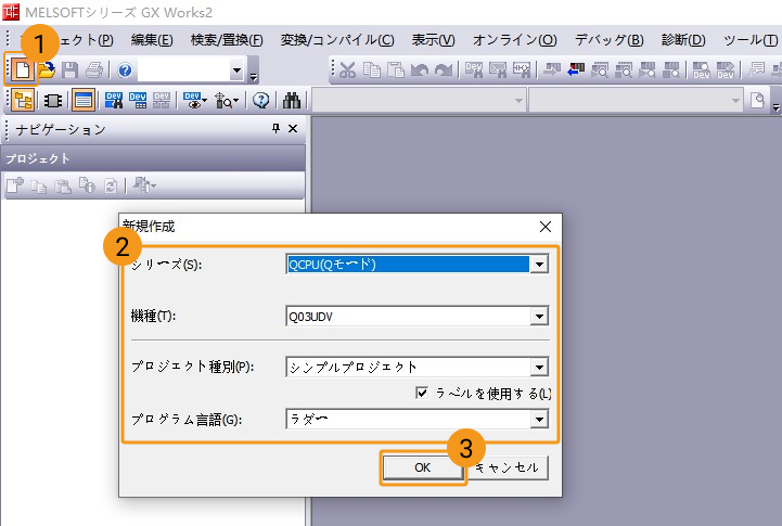 GX Works2ソフトウェアを起動し、ツールバーの 新規作成 アイコンをクリックします。新規作成の画面で、シリーズを QCPU(Qモード) に、機種を Q03UDV に、プロジェクト種別を シンプルプロジェクト に設定します。その後、ラベルを使用する にチェックを入れ、プログラム言語を ラダー に設定して OK をクリックします。