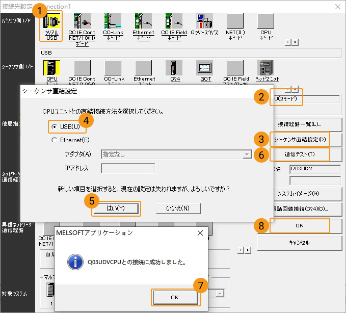 次に、接続先指定 Connection1 の画面で 通信テスト をクリックします。「Q03UDVCPUとの接続に成功しました」 というメッセージが表示されれば、パソコンのGX Works2ソフトウェアはハードウェアPLCと正常に通信しています。