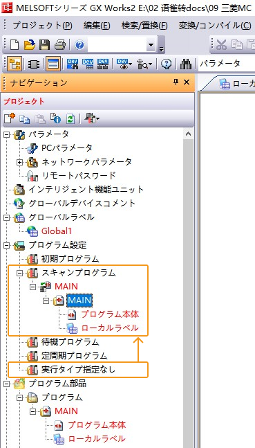 GX Works2ソフトウェア画面で、左側にある「プログラム設定」を展開し、実行タイプ指定なし の下の MAIN を スキャンプログラム にドラッグして展開し、プログラム本体 をダブルクリックします。