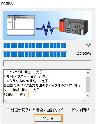 プログレスバーの下のテキストボックスに PLC書込:終了 と表示されたら、閉じる をクリックします。
