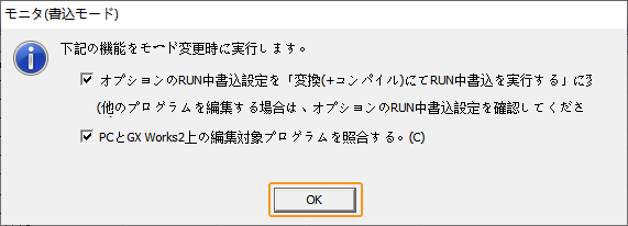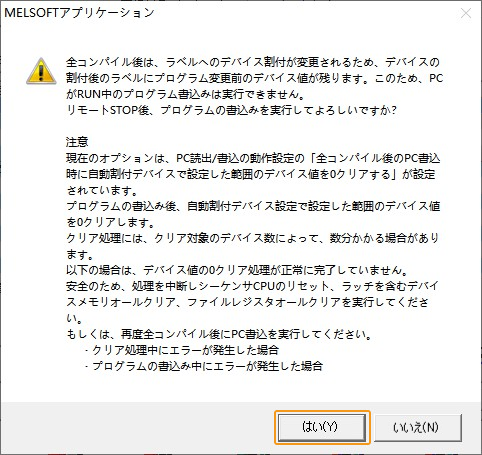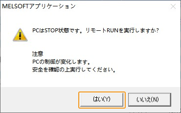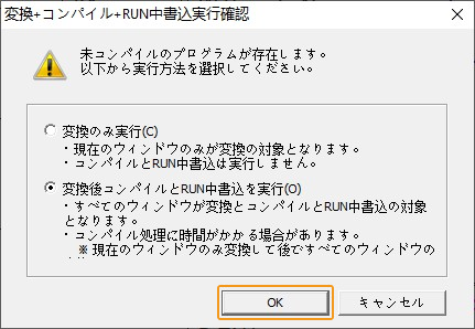 変換+コンパイル+RUN中書込実行確認 画面がポップアップします。OK をクリックします。