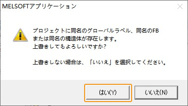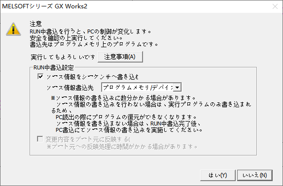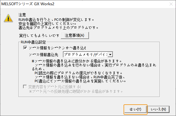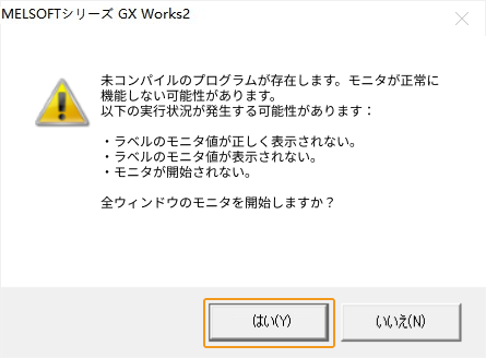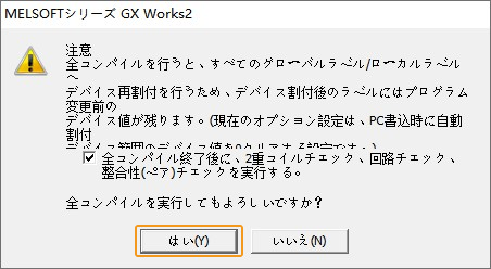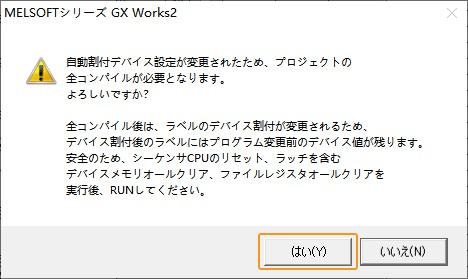 プロンプト画面で はい をクリックし、GX Works2のソフトウェア画面に戻ります。