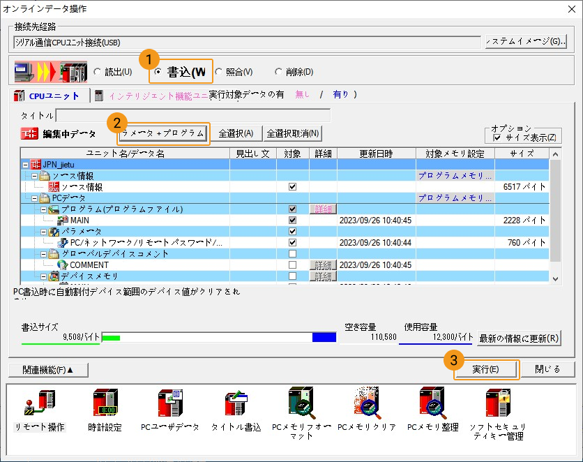 オンラインデータ操作 画面ポップアップします。書込 を選択し、パラメータ+プログラム をクリックして 実行 をクリックします。