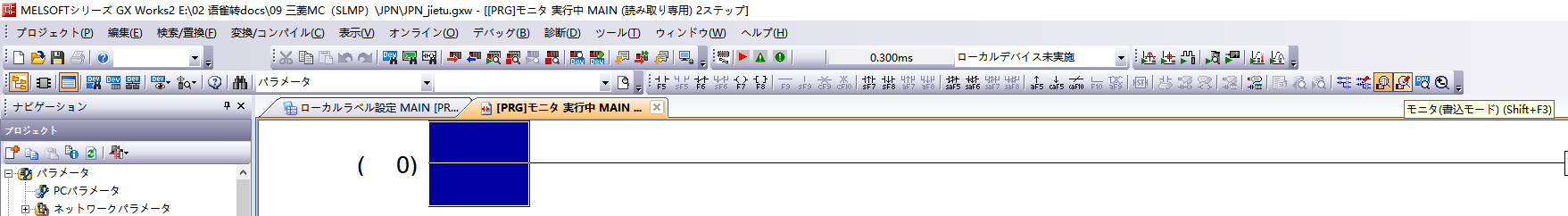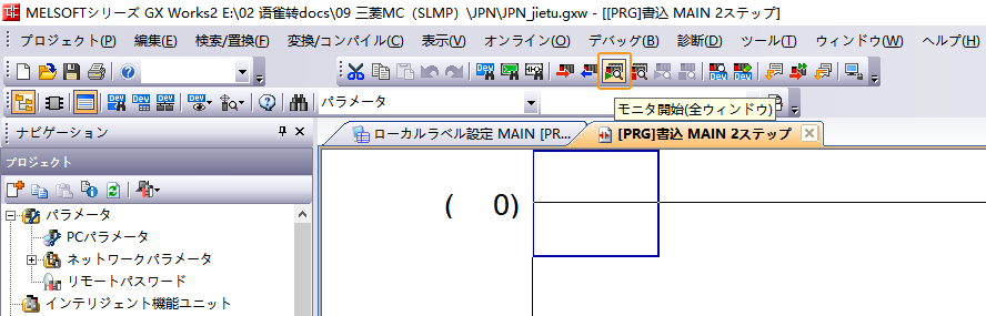 GX Works2ソフトウェア画面で、ツールバーの モニタ開始(全ウィンドウ) をクリックします。