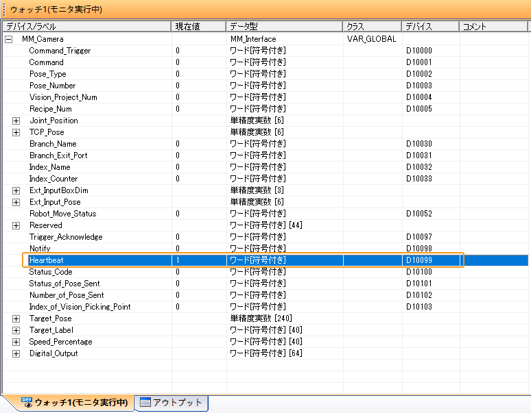 ウォッチ1の画面で、MM_Cameraを追加して展開します。接続が成功すると、Heartbeatのハートビート信号モニタ値が連続的に変化します。