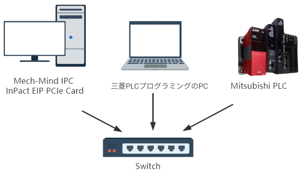 以下では、三菱電機㈱のQシリーズPLC(内蔵Ethernetインターフェースユニット)とMech-Mindビジョンシステムとの標準インターフェース通信をMitsubishi MC方式で接続するための設定方法について説明します。