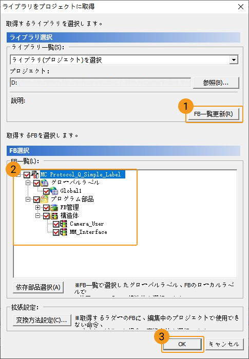 ライブラリをプロジェクトに取得 の画面で FB一覧更新 をクリックします。FB選択 エリアですべての項目を選択して OK をクリックします。