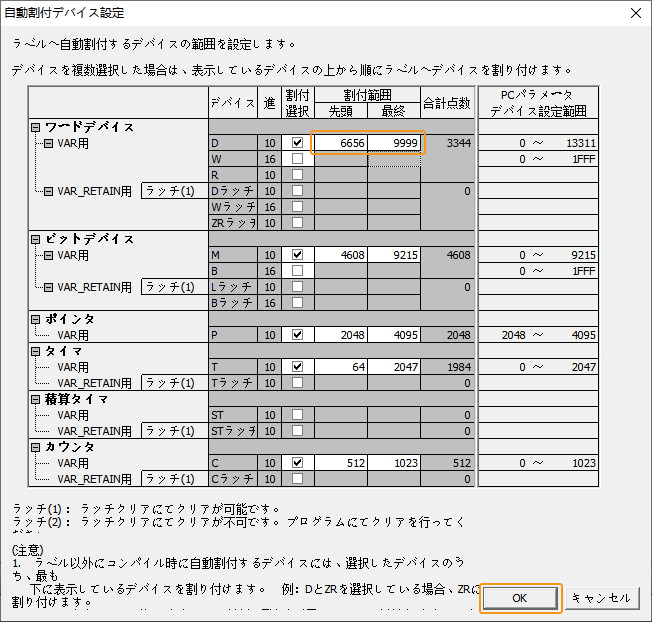 自動割付デバイス設定 画面がポップアップします。ワードデバイスのDの割付選択を変更して OK をクリックします。