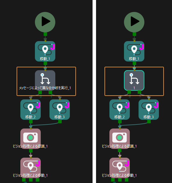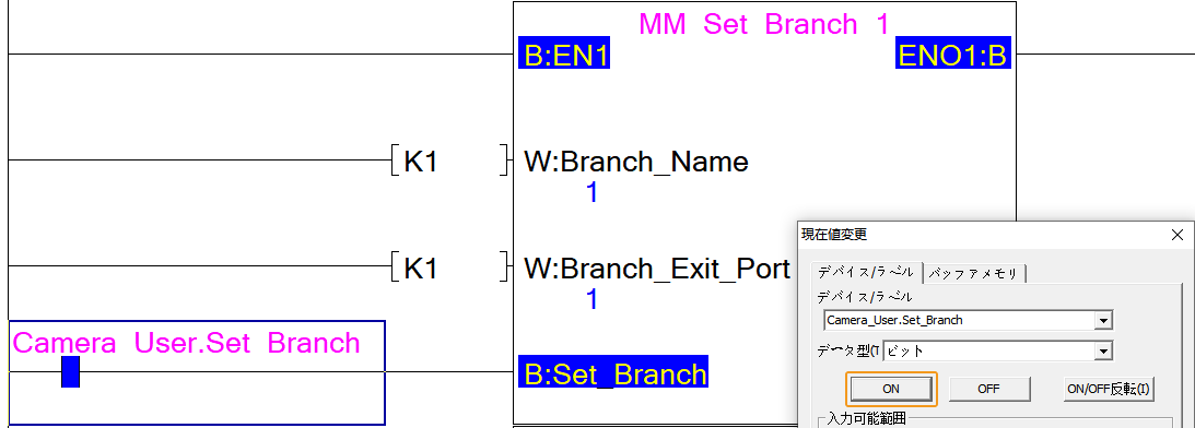 MM_Set_Branch機能ブロック入力側の「Camera_User.Set_Branch」変数を選択してONに変更し、Mech-Vizの分岐を選択します。