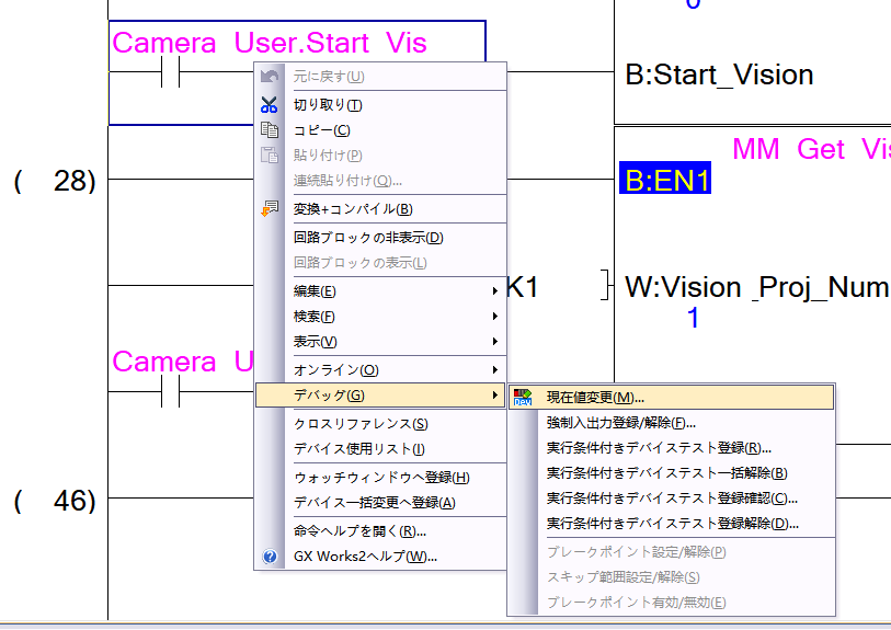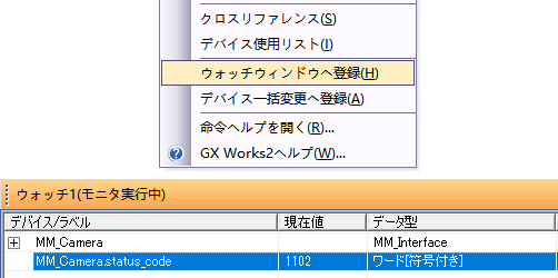プログラムの空白場所を右クリックし、ウォッチウィンドウへ登録 を選択し、グローバルラベル MM_Camera.Status_Code を入力します。返された値が 1102 の場合、プロジェクトが正常に実行されたことを意味します。