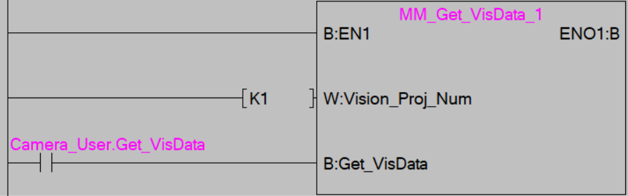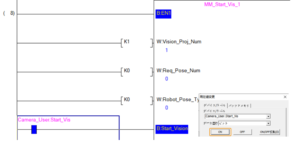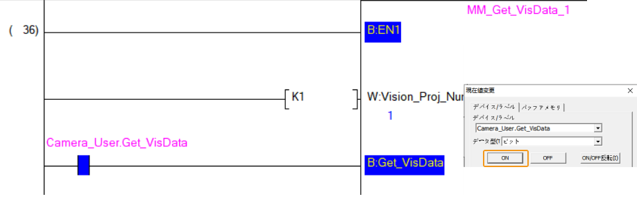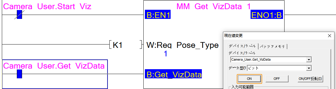 MM_Get_VisData機能ブロックの入力側「Camera_User.Get_VisData」変数を選択し、それをONに変更してビジョンポイントを取得します。