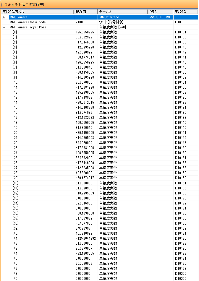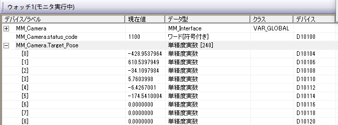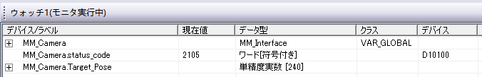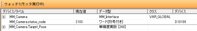 ウォッチ 画面で、グローバルラベル MM_Camera.Status_Code を入力します。返された値が 1100 の場合、位置姿勢結果が正常に取得されたことを意味します。グローバルラベル MM_Camera.Target_Pose を入力すると、返された値がビジョンポイントのデータとなります。