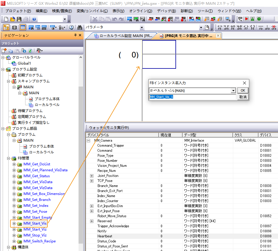 プログラム部品/FB管理 を展開し、MM_Start_Visを MAIN/0行目 にドラッグします。下図のような画面がポップアップします。ここでは初期値を使用し、OK をクリックします。