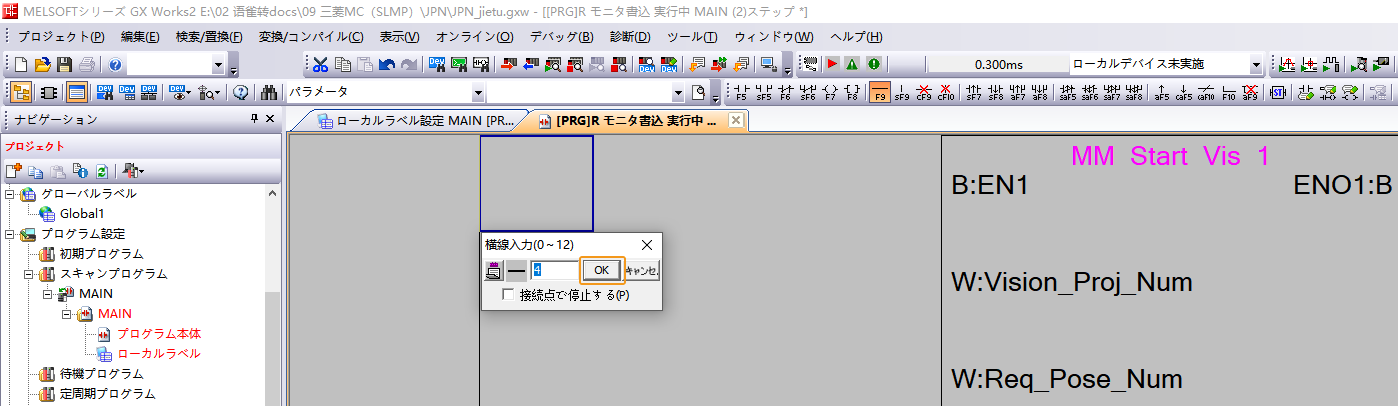 MM_Get_VisData を MAIN/0行目 にドラッグすると、FBインスタンス名入力 画面がポップアップします。ここでは初期値を使用し、OK をクリックします。ツールバーの 横線入力 をクリックして OK をクリックすると、左バスバーが機能ブロック入力EN1ポートに接続されます。