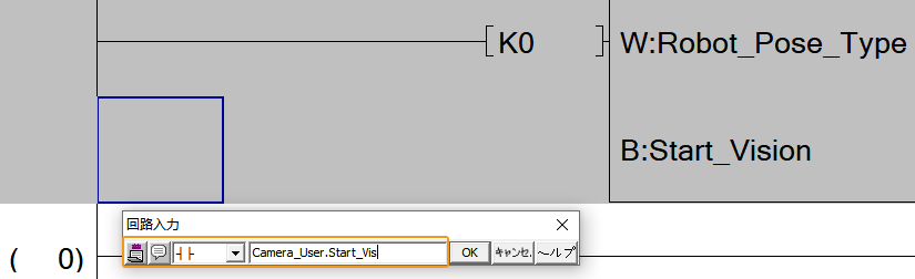 MM_Start_Vis機能ブロックの入力側「Start_Vision」ポートの同行左端をダブルクリックし、ノーマリーオープン接点を選択し、グローバルラベル Camera_User.Start_Vis を入力して OK をクリックすると、左バスバーとStart_Visionポートが接続します。