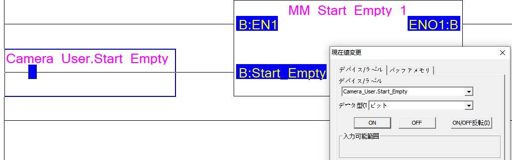 MAINメインプログラムの画面で、MM_Start_Empty機能ブロックの入力側「Camera_User.Start_Empty」ポートを右クリックし、 を選択します。それをONに変更し、前回取得したビジョン結果がクリアされたら、この変数をリセットします。
