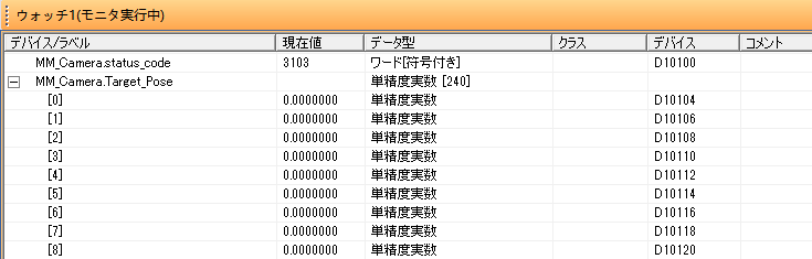 ウォッチ 画面で、グローバルラベル「MM_Camera.Status_Code」を入力すると、3103 が返され、グローバルラベル「Camera_User.Target Pose、Camera_User.Target Label、Camera_User.Target Tool ID」の変数値がクリアされます。