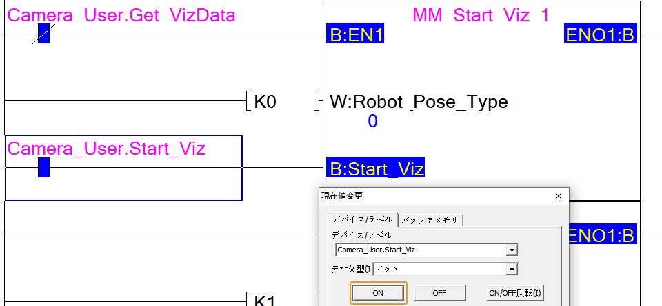 ここで Request_Pose_Type と関数MM_Start_Vis、MM_Start_Vizの Robot_Pose_Type が、グローバルラベル「MM_Camera」の Pose_Type ラベルに対応していますが、設定する値が異なると同時に有効ではありません。 -