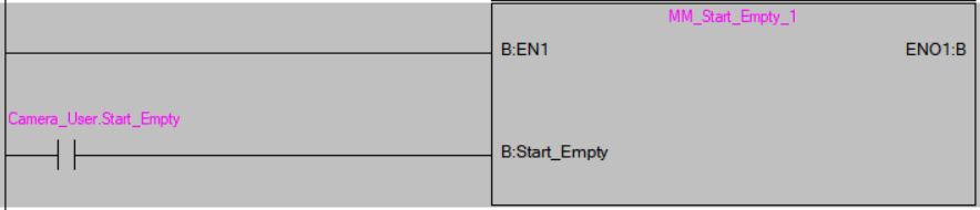 MM_Start_Empty機能ブロックの入力側「Start_Empty」ポートの同行左端をダブルクリックし、ノーマリーオープン接点を選択し、グローバルラベルCamera_User.Start_Emptyを入力して OK をクリックすると、Start_Emptyポートに接続されます。