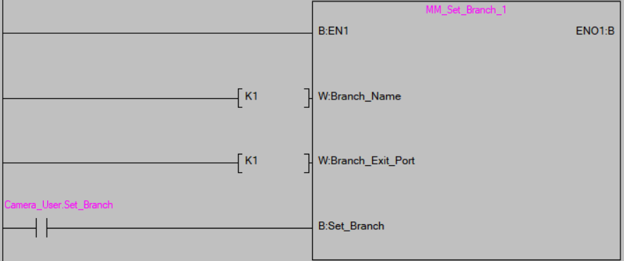 Mech-Vizプロジェクトの分岐パラメータを設定します。Branch_Name、Branch_Exit_Portのポート値をそれぞれ1に設定すると、Mech-Vizプロジェクトが分岐1に実行したときに出口1から実行を続けることが指定されます。グローバルラベル Camera_User.Set_Branch を入力し、ノーマリーオープン接点を選択して OK をクリックすると、Set_Branchポートに接続されます。