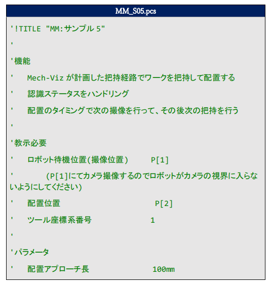 サンプル⑤「MM_S05」は、通常のMech-Vizを利用したフロー( サンプル②)を元に、生産ラインに運用される際注意すべき点を配慮しながら、処理を行います。