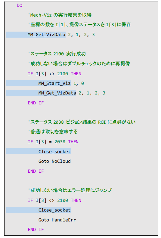 3D ROI内に点群なしや実行エラーの場合、突如発生する予期しない事情(想定外の物の写り込み、カメラ振動による撮像不良、電圧不安定)による誤判を防ぐため、もう一度再撮像を行うことが多いです。ただし、サンプルではエラー処理の部分で、撮像位置に戻して実行終了としています。運用の際は適宜変更してください。