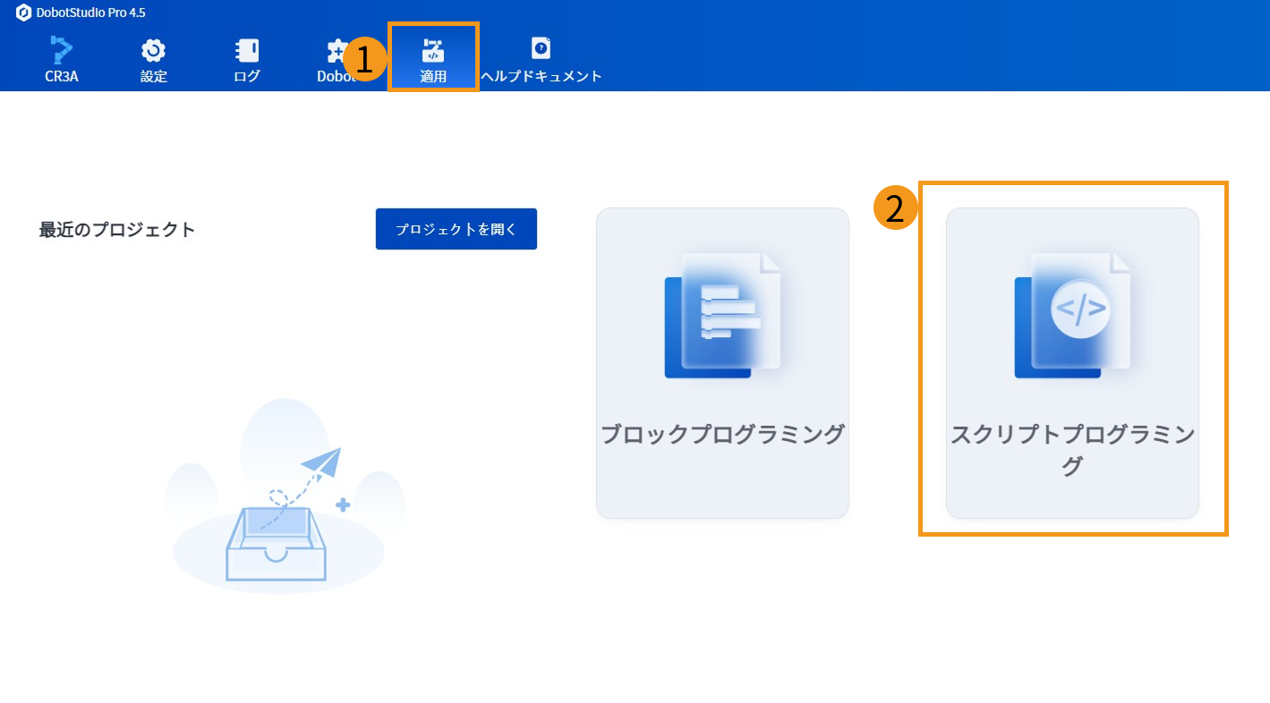 DobotStudio Proのメイン画面の 適用 をクリックします。適用 パネルで スクリプトプログラミング をクリックしてプロジェクトを新規作成します。新規作成したプロジェクトには、以下のようにsrc0.luaとglobal.luaの2つの空のファイルがあります。