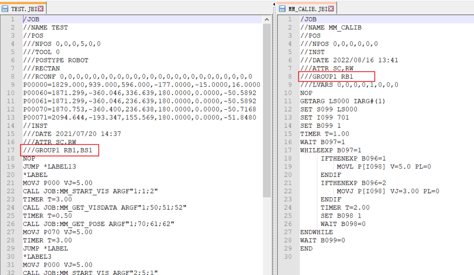 Communication Component/Robot_Interface/YASKAWA/JBI/MM_CALIB.JBIファイルを開き、読み込まれたファイルとMM_CALIB.JBIファイルを比較し、軸構成の設定が一致しているか確認してください。例えば、下図では左側が読み込まれたファイル、右側がMM_CALIB.JBIファイルであり、両者の軸構成設定が一致していないことが分かります。