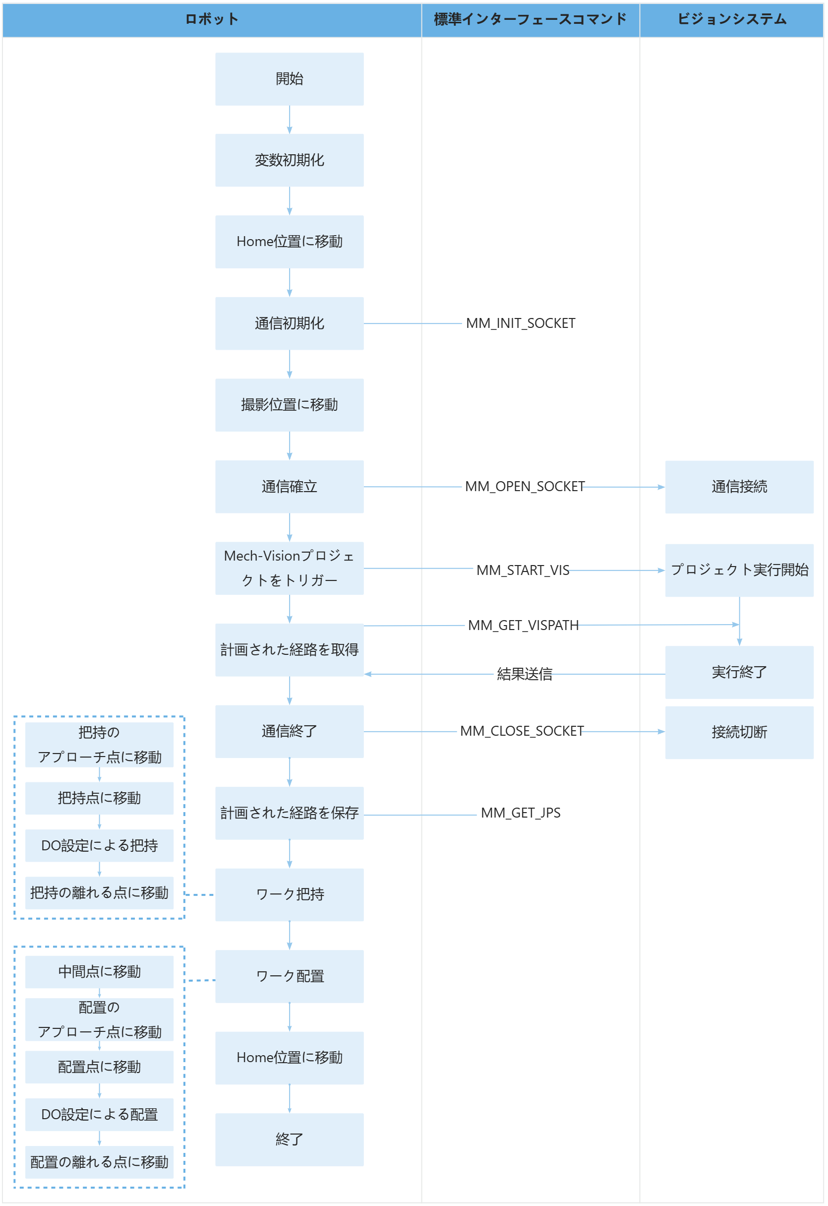 ロボットは MM_OPEN_SOCKET コマンドを使用して、ビジョンシステムとの間のTCPプロトコル通信接続を確立します。 |