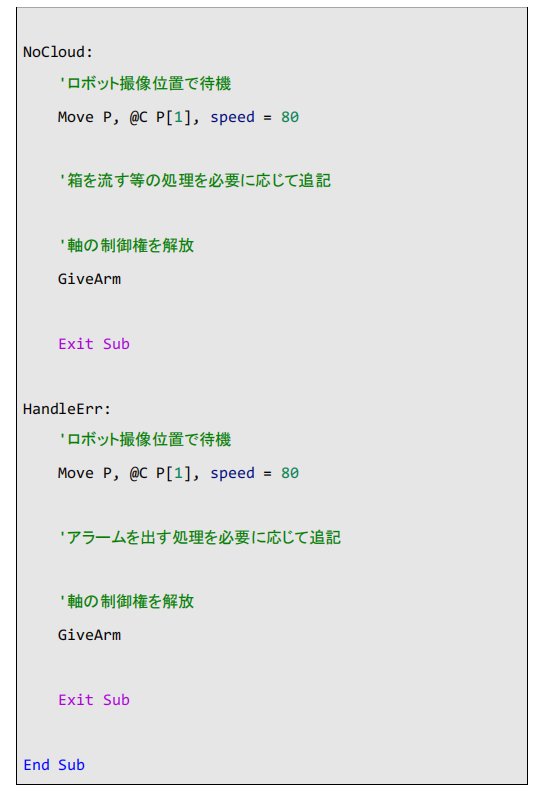 3D ROI内に点群なしや実行エラーの場合、突如発生する予期しない事情(想定外の物の写り込み、カメラ振動による撮像不良、電圧不安定)による誤判を防ぐため、もう一度再撮像を行うことが多いです。ただし、サンプルではエラー処理の部分で、撮像位置に戻して実行終了としています。運用の際は適宜変更してください。