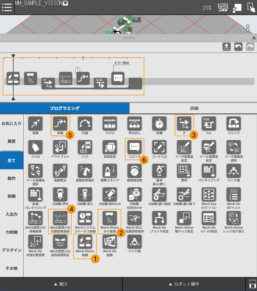 1. 新しいロボットプログラム(本サンプルではMM_SAMPLE_VISION)を作成し、プログラミング を選択、左側の 全て リストから以下のコマンドを図に従ってドラッグします。