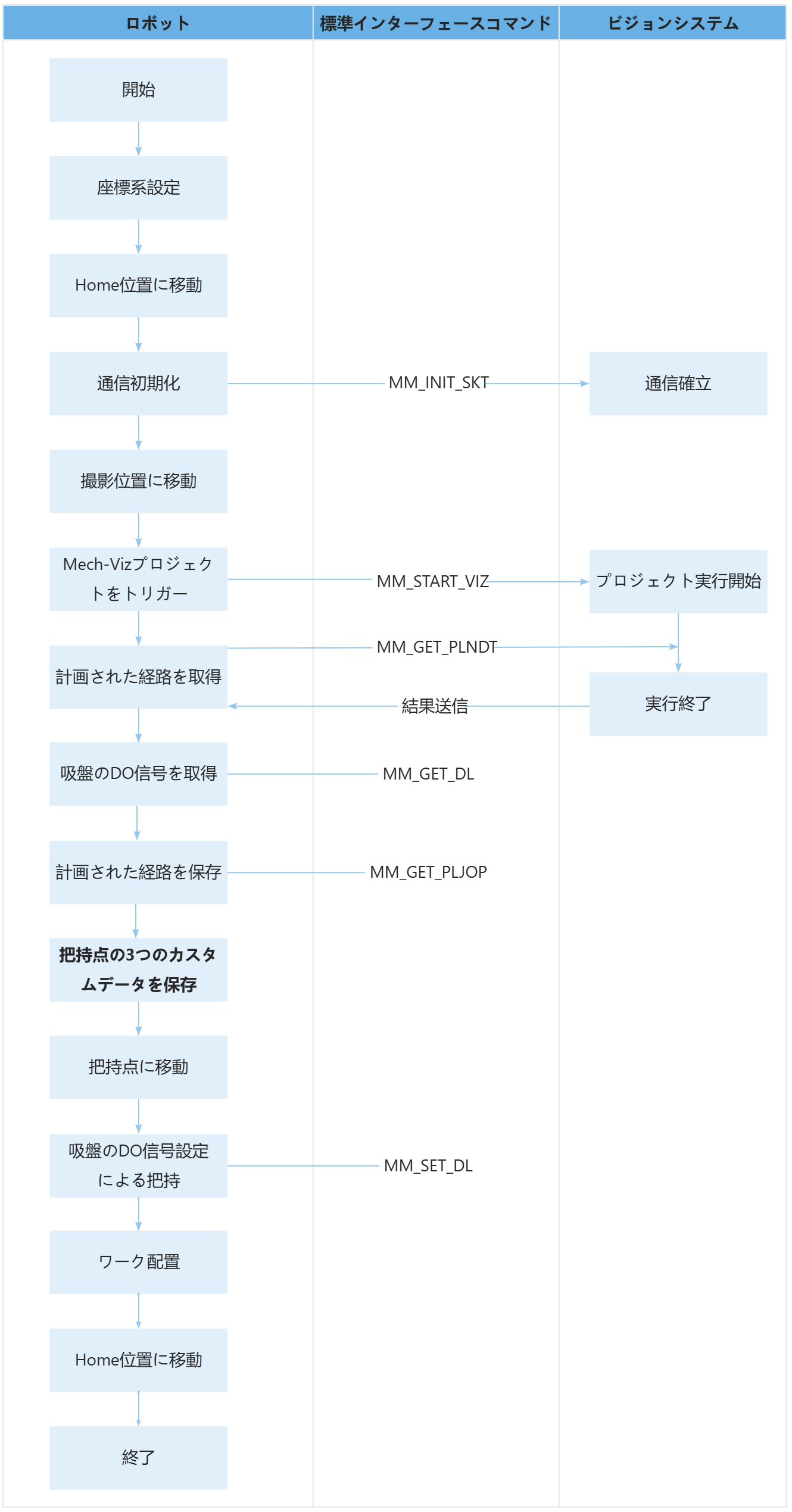 ロボットは MM_GET_PLNDT コマンドを使用して経路点の「ビジョン処理による移動」の計画結果とカスタムデータを取得し、その後、MM_GET_PLJOP コマンドを通じて経路点の「ビジョン処理による移動」の計画結果とカスタムデータをロボットメモリから指定されたレジスタに保存します。このサンプルでは、把持点(イチレジ[61])のカスタムデータがレジ[94]から格納されます。 上記のコードは、「ビジョン処理による移動」の経路点(把持点)の3つのカスタムデータレジ[94]、レジ[95]、レジ[96]をそれぞれレジ[10]、レジ[11]、レジ[12]に代入することを意味します。