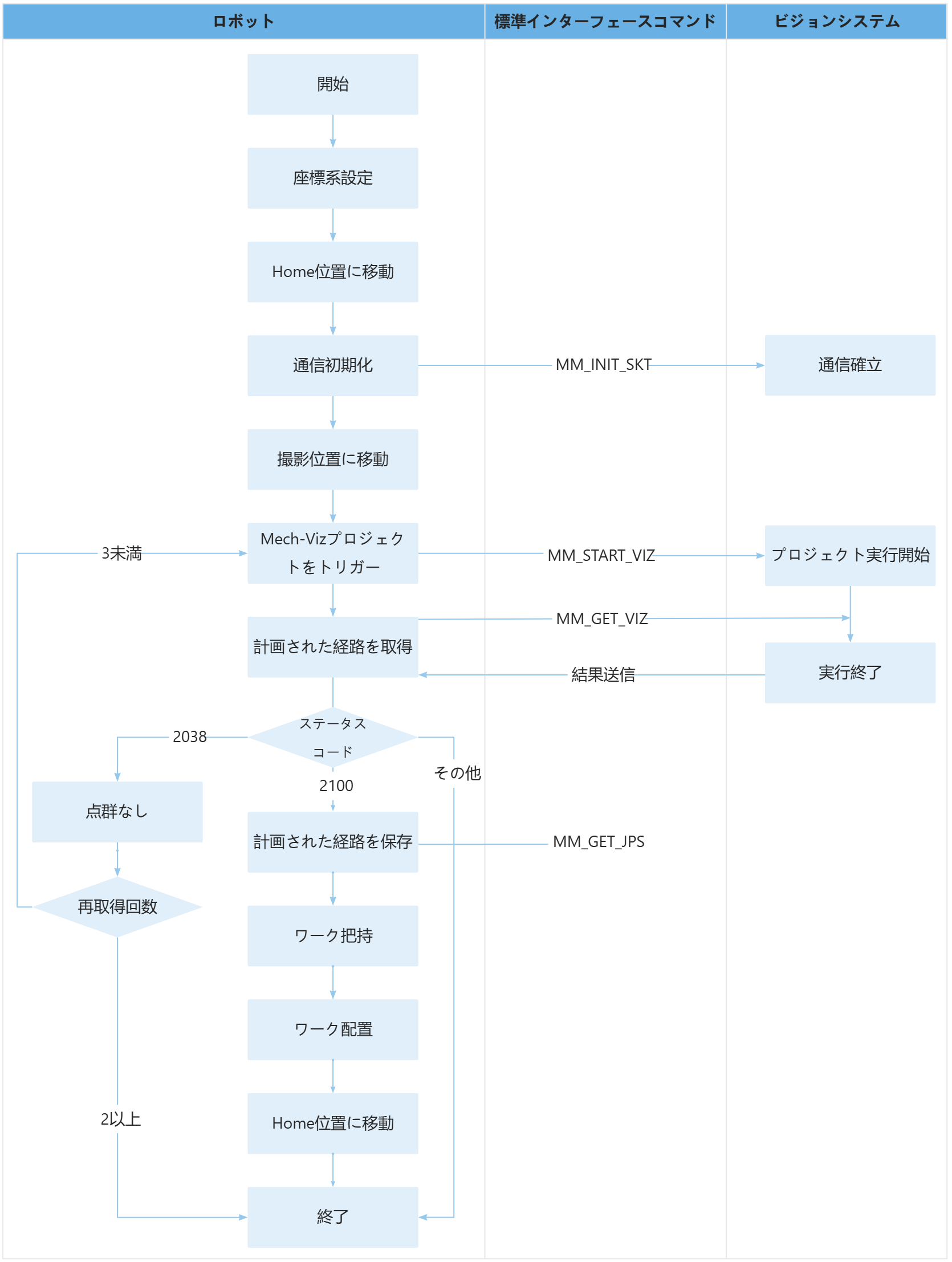 ロボットはMech-Vizプロジェクトをトリガーして実行し、計画された経路を取得します。その後、ステータスコードを確認して、計画された経路が正常に取得されたかどうかを判断します。経路が正常に取得できた場合、ロボットは把持および配置を実行します。それ以外の場合は、ロボットは停止します。 |
