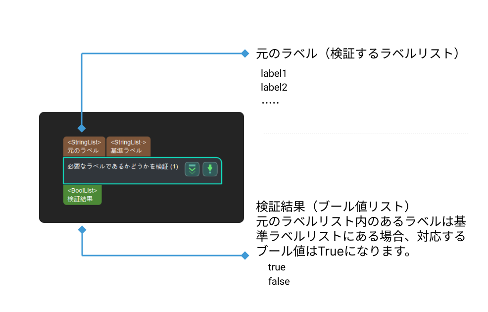 入力された元のラベルと基準ラベルリストを比較し、比較結果をブール値のリストとして出力できます。
