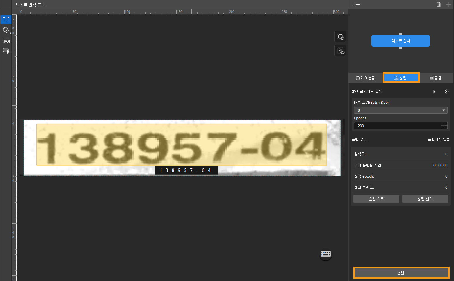 이미지 레이블링 : 레이블링 툴 바에서 "텍스트 인식 도구"를 선택해 이미지를 레이블링합니다. "텍스트 인식 도구"로 선택 영역을 지정하면 인식 결과가 자동으로 아래에 표시되며, 수동 확인 후 확정해야 합니다. 따라서 선택 영역을 정확히 설정하고, 인식 결과를 꼼꼼히 확인하는 것이 중요합니다.