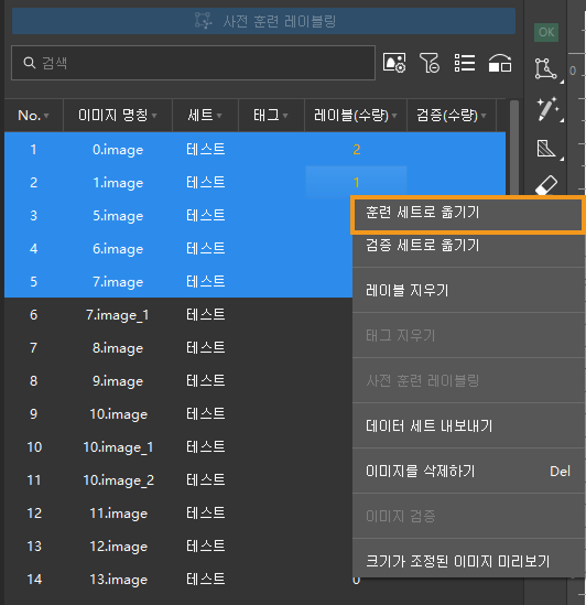 아이콘을 클릭하거나, 해당 이미지 항목을 마우스 오른쪽 버튼으로 클릭하여 OK로 설정하기를 선택합니다. 이후 다시 이미지 항목을 마우스 오른쪽 버튼으로 클릭하여 훈련 세트로 옮기기를 선택합니다.